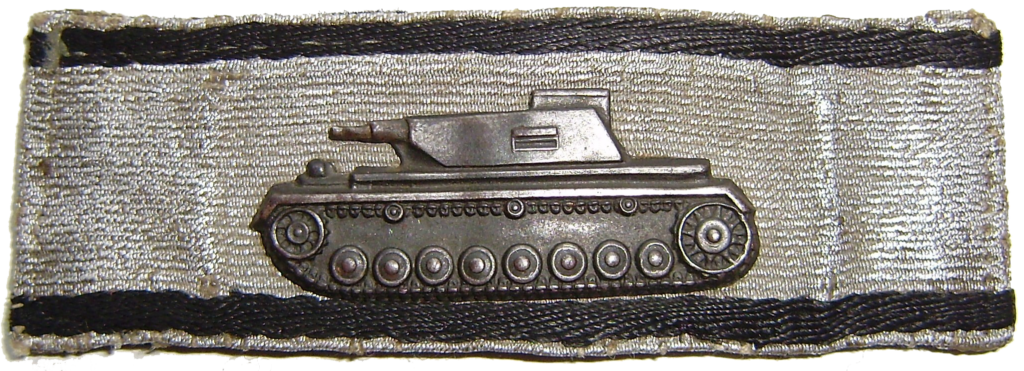 - Das Abzeichen besteht aus einem Band aus Aluminiumgespinst von 90 mm Länge und 32 mm Breite mit zwei eingewirkten schwarzen Streifen (3 mm breit), auf dem die aus Blech gestanzte Silhouette eines Panzerkampfwagens in Schwarz angebracht ist.